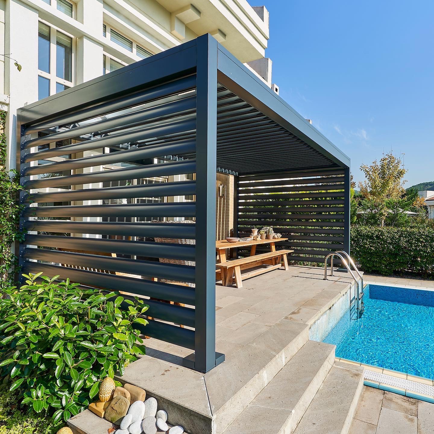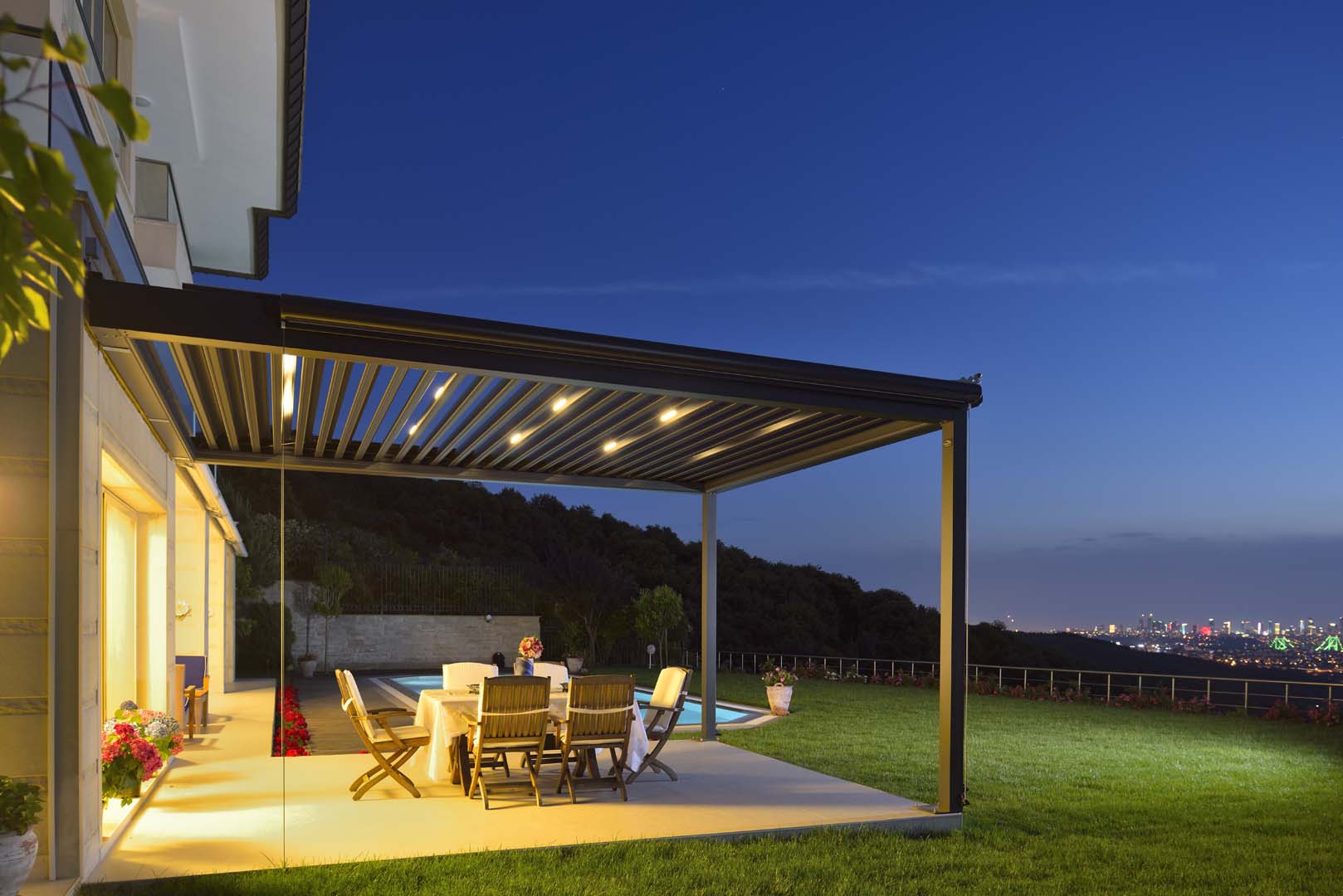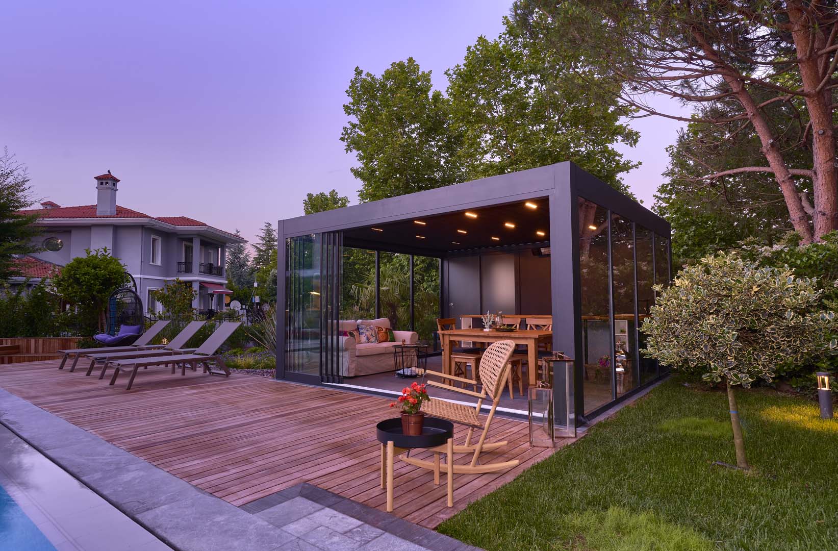 Hareketli alüminyum paneller sayesinde ışık ve hava akışını kontrol edin. Yağmur, rüzgar ve güneşe karşı üstün koruma sunarak her mevsim dış mekan yaşamını mümkün kılar.